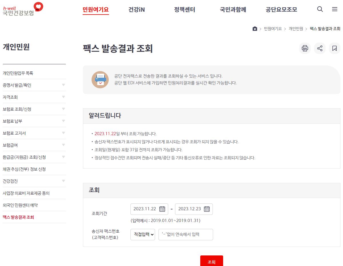 국민건강보험공단으로 서류를 팩스로 보낸 경우, 보낸 사람의 전화번호로 수신여부를 조회할 수 있다고 합니다. MMS이미지 문자를 사용하는 일부 무료 모바일팩스앱은 가입할 때 준 송신번호로 검색해야 할 것 같네요. 그리고 'OO/O팩스'류 온라인팩스 서비스의 경우는 개인발신번호를 주는 옵션으로 서비스에 가입하지 않았다면 아마 공용 번호로 보낼 것 같은데(회사마다 다를 겁니다) 그럼 이걸로 조회되지 않을 것 같습니다.
