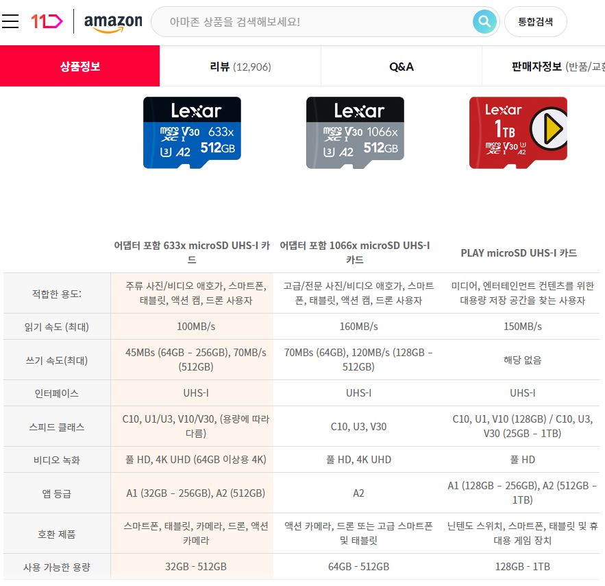 출처는 11번가-아마존의 렉사 메모리카드 제품정보입니다.