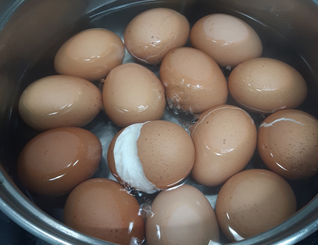 계속 센불로 끓이면 이렇게 갈라진 계란이나, 아예 흰자나 노른자가 터지듯 나온 계란이 생긴다.