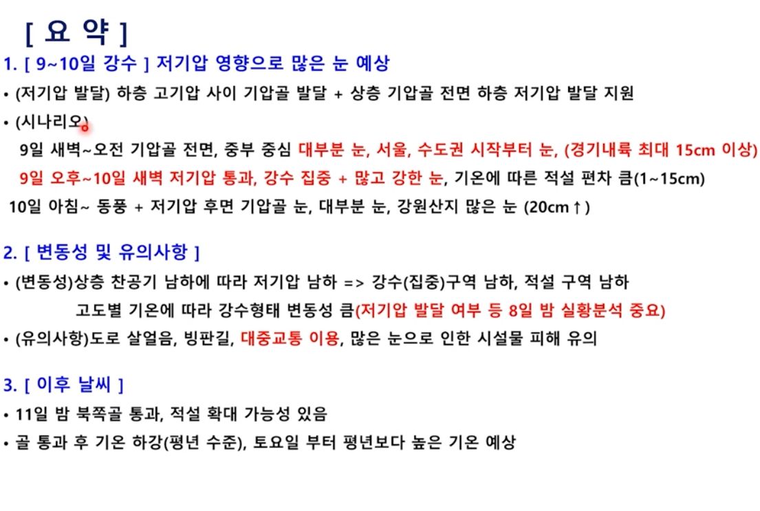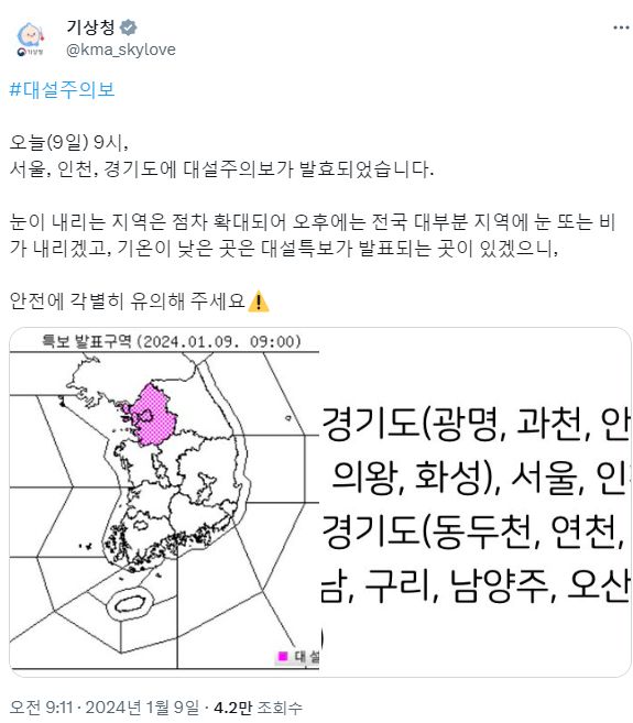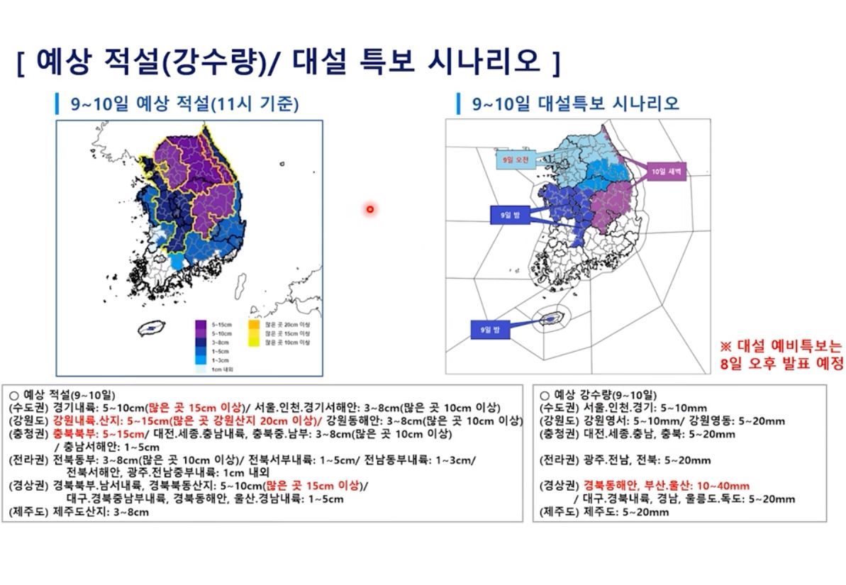 9~10일 많은 눈 주의! 서울 등 중부지방 대설특보! 남부도 주의!