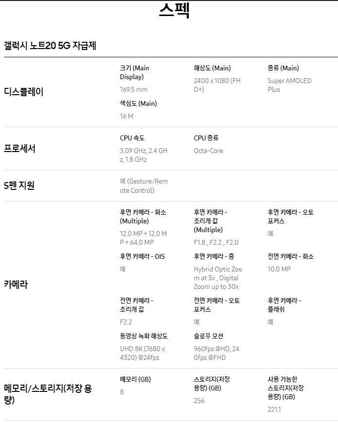 갤럭시 노트20(SM-N980, SM-N981) 제품정보 약간 본문