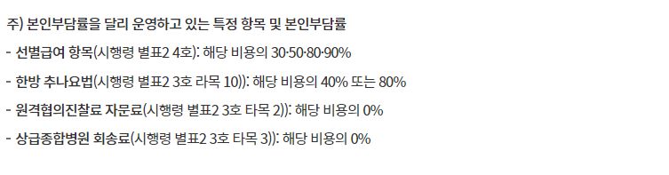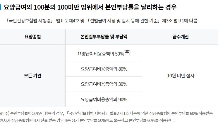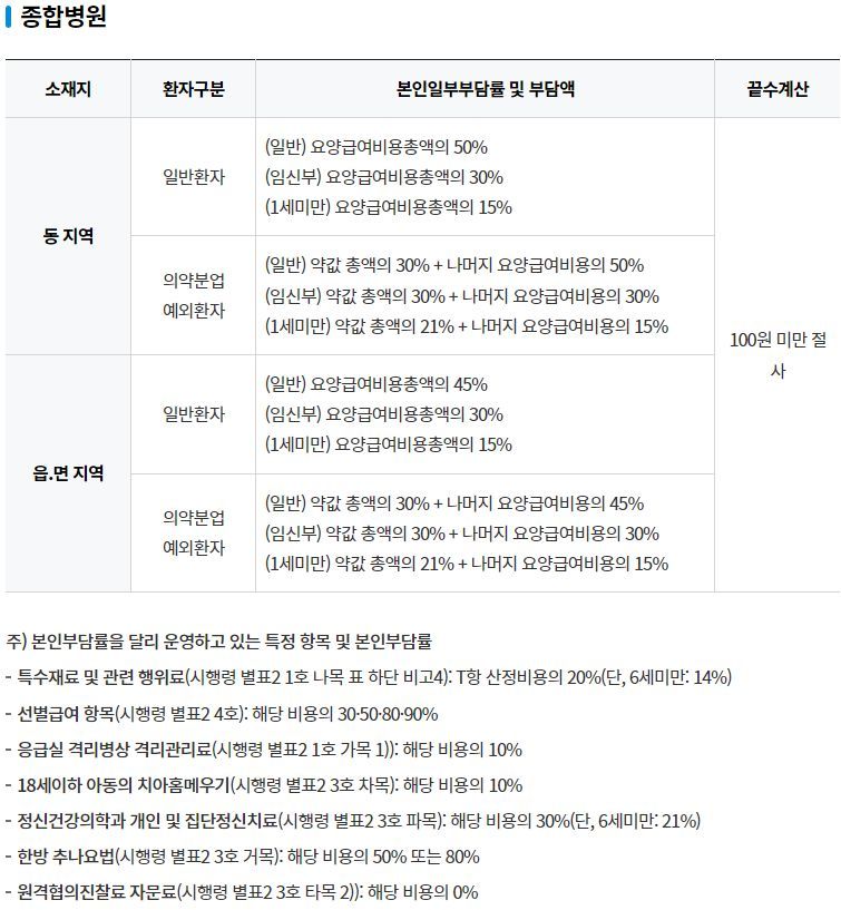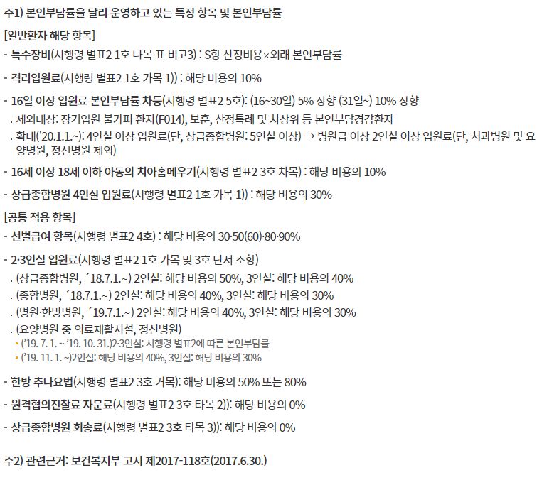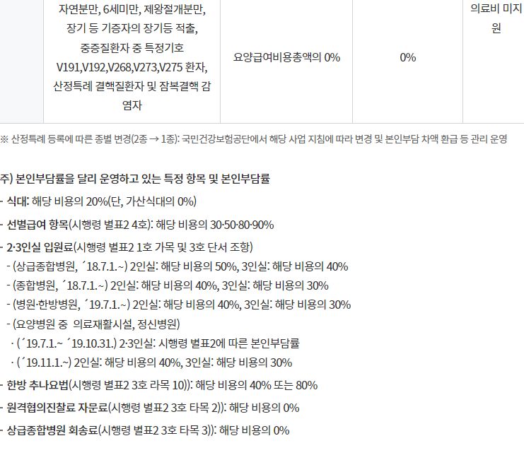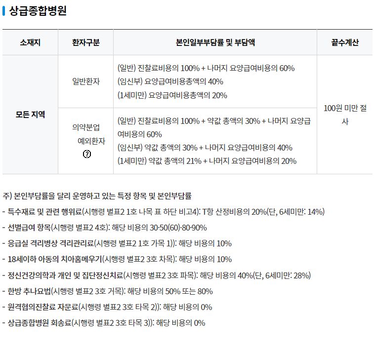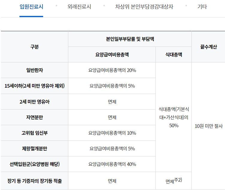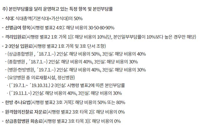 이것을 기본으로, 표 아래에 붙은 각주처럼 '케바케'입니다. 경우에 따라 다릅니다. 상급종합병원 4인실은 20%가 아니라 30%, 그 외 일반적으로 2~3인실 이용시 본인부담률 상향, 16일 이상 입원시 본인부담률 상향 등