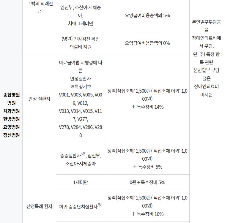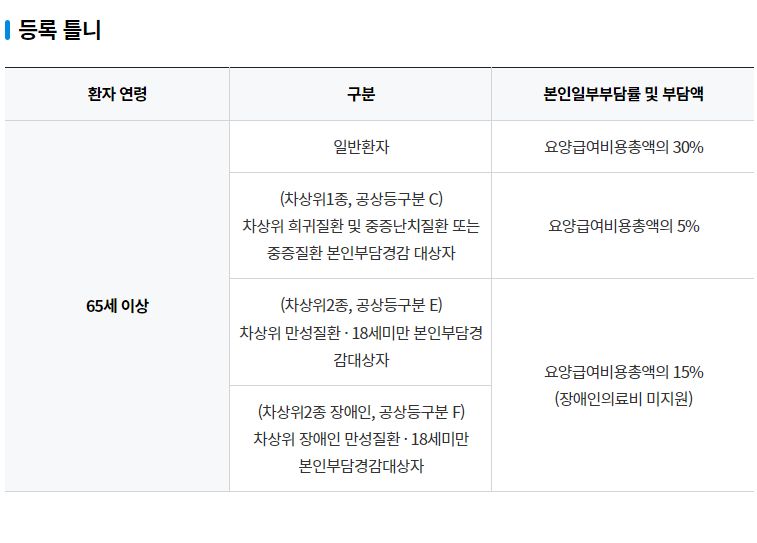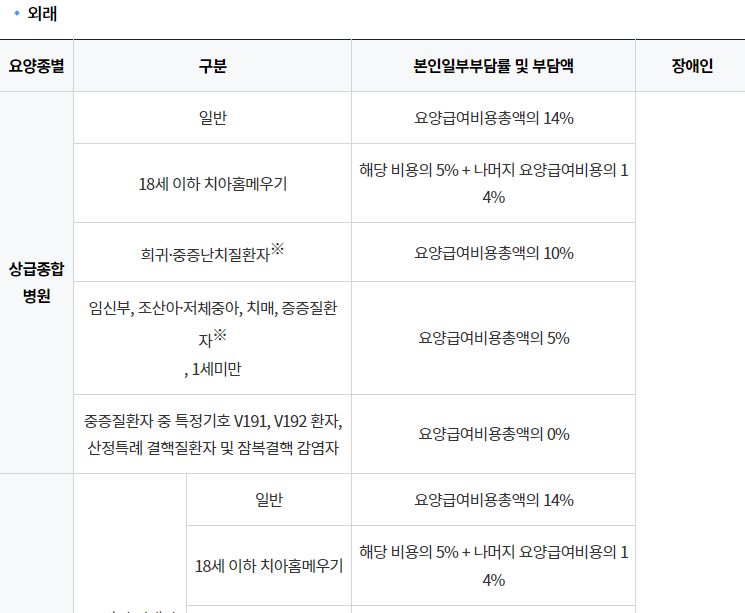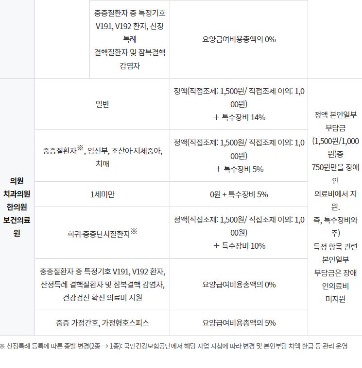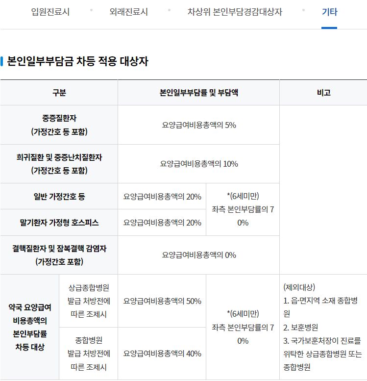 본인일부부담금 차등 적용 대상자: 중증질환자(가정간호 등 포함), 희귀질환 및 중증난치질환자(가정간호 등 포함), 일반 가정간호 등, 말기환자 가정형 호스피스, 결핵질환자 및 잠복결핵 감염자(가정간호 포함), 약국 요양급여 비용총액의 본인부담률 차등 대상