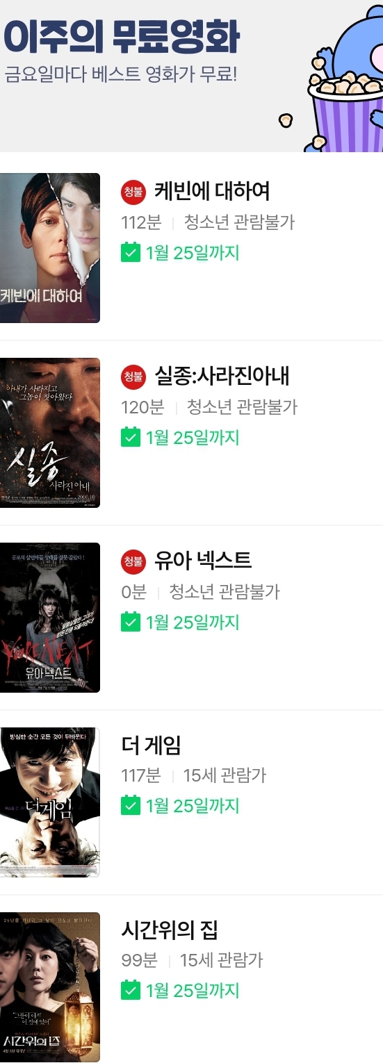 | (네이버시리즈온 무료영화) 마진 콜, 더 게임, 실종:사라진 아내, 케빈에 대하여, 시간위의 집, 유아 넥스트, 케빈에 대하여, 패밀리 맨 등 (0) | 2024.01.12 |