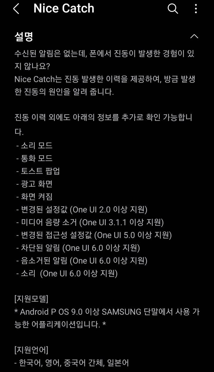 수신된 알림은 없는데, 폰에서 진동이 발생한 경험이 있지 않나요? Nice Catch는 진동 발생한 이력을 제공하여, 방금 발생한 진동의 원인을 알려 줍니다. 진동 이력 외에도 아래의 정보를 추가로 확