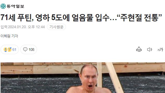 71세 푸틴, 영하 5도에 얼음물 입수…“주현절 전통”
