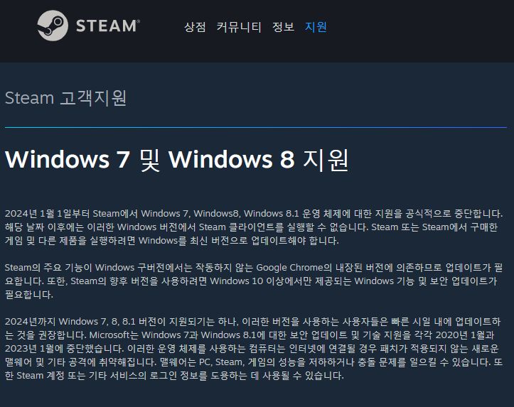 2024.1.1.~ :스팀(Steam), 윈도우7/8/8.1 지원 공식 중단 본문