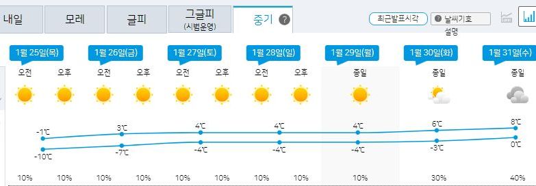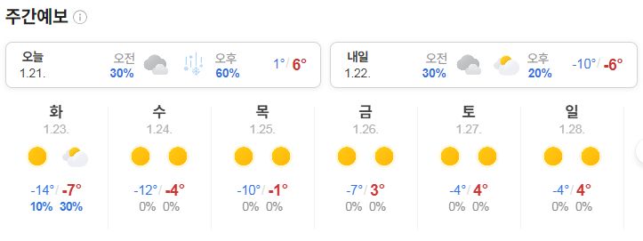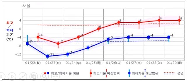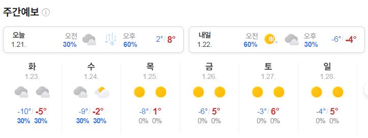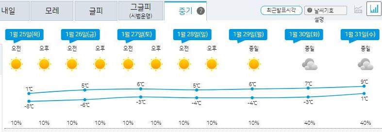 | 2024.1.13(일)~1.22(월) 기상청 날씨: 주초반 춥고, 주후반 풀리고, 22일에 다시 춥고 (0) | 2024.01.13 |