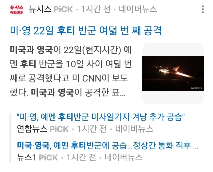 현지 언론 "수도 사나와 여러 주에서 폭격 보고" 미국과 영국이 예멘 내 후티 반군 군사시설을 공습하는 두번째 연합작전을 벌였다고 22일(현지시간) AP 통신과 로이터 통신이 보도했다. 이 매체