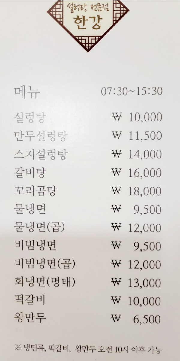 한강: 냉면, 갈비, 설렁탕, 갈비탕 종류