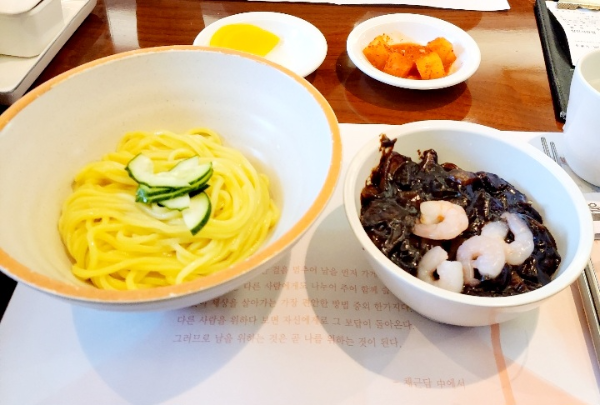 아래 사진은 주문해본 삼선짜장면. 오징어와 돼지고기가 들어간 짜장소스에 칵테일새우가 얹혔던가 그랬습니다.