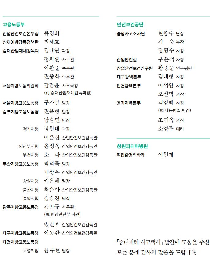 제목 고용노동부, 반면교사를 위해 이야기와 교훈이 있는 「중대재해 사고백서」 최초 발간 등록일 2023-11-07 조회 13214 - 지난 사고에서 중대재해 예방의 교훈을 얻다! - 고용노동부(장관 이