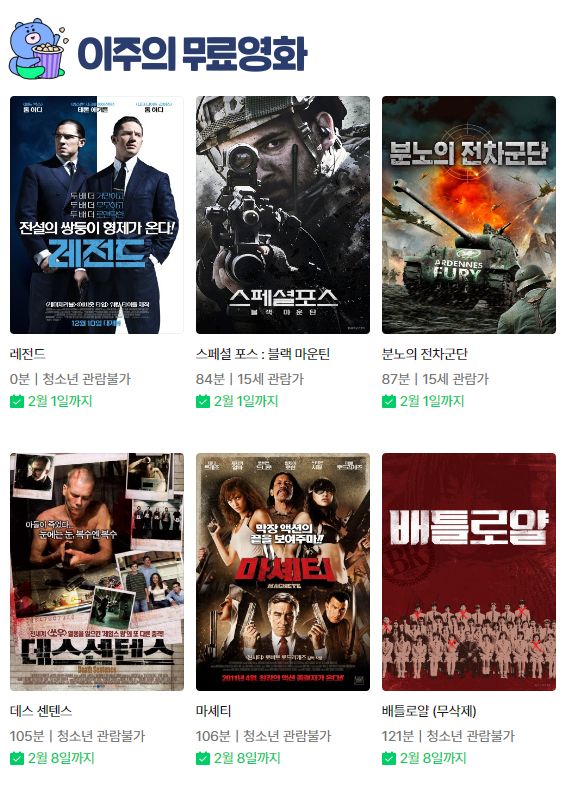 (네이버 시리즈온 무료영화) 레전드, 스페셜 포스:블랙 마운틴, 분노의 전차군단, 배틀로얄(무삭제), 배틀로얄2- 레퀴엠 등 본문