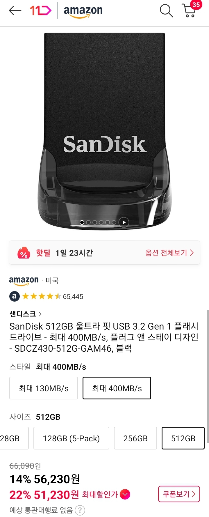샌디스크 512GB USB메모리, USB 3.1 ~130MB/s (~4.1만), USB 3.2 Gen 1 ~400MB/s (~5.1만) 본문