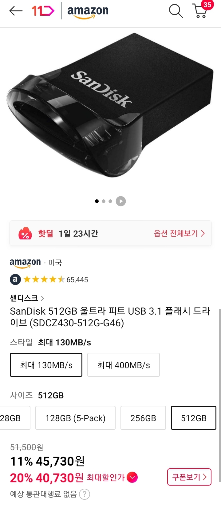 [11번가] SanDisk 512GB 울트라 피트 USB 3.1 플래시 드라이브 (SDCZ430-512G-G46)