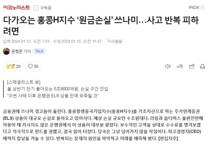 홍콩항생중국기업지수(홍콩H지수) 부진이 이어지면서, 이와 연계한 주가연계증권(ELS) 상품의 대규모 원금 손실 가능성이 커지고 있다. 금융당국은 ELS 불완전 판매 여부를 조사하고 있다. 5대 은