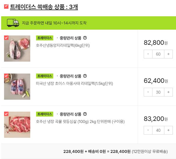 트레이더스 멤버십 비회원이 SSG.COM 에서 온라인구매할 때는, 장바구니에 넣으면 12만원이상 무료배송. 그 미만 4천원. 판매단위가 몇 KG단위로 나와서 배송비는 상대적으로 큰 부담이 안 됩니다.