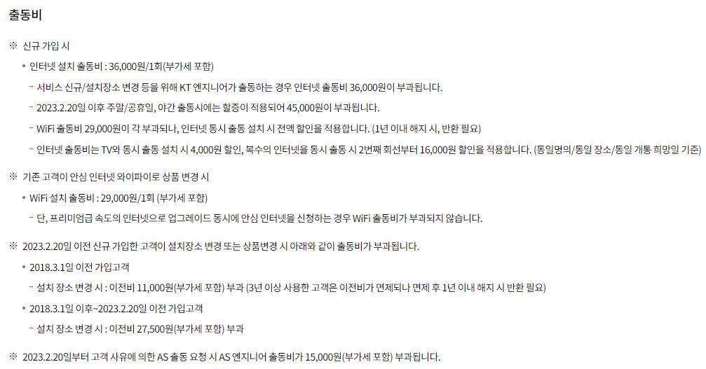 와이파이 설치 출동비가 부과되는 경우(인터넷을 처음 설치할 때나 프리미엄급 인터넷으로 업그레이드시에는 와이파이출동비는 면제),