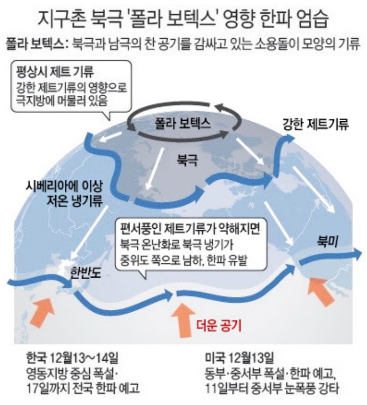 그런데, 어느 기사를 보니 요즘 삼한사온이 없다니 기자님 무슨 말씀인가요? 올 겨울은 한파가 삼한사온에 끼어든 것 같은데요. 며칠 춥다가 며칠 풀렸다가 하지 않았나요? 그리고 그 한파는 크게 보면 제트기류가 약해져 북극의 찬 공기가 직접 내려오는 바람(북풍)을 맞아 생긴 것이라던데.