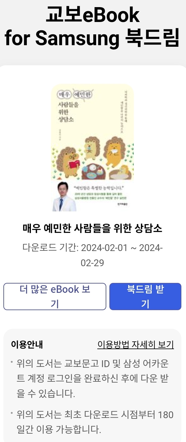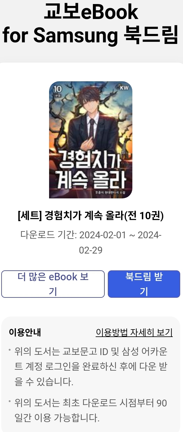 교보ebook for samsung 앱사용자를 위한 이달의 무료대여책입니다. 기본적으로 삼성전자 갤럭시 단말기 사용자가 교보문고 온라인서점, 삼성스마트폰 삼성계정을 가지고 있고, 갤럭시스토어에서 이 앱을 받아 깔면 이용가능합니다.