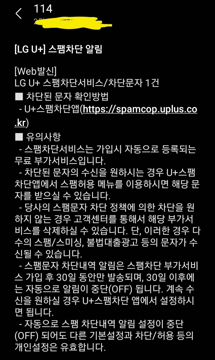 LGU+나 거기 망을 사용하는 알뜰폰 사용자가 스팸차단서비스를 이용할 때 뜨는 안내문자: