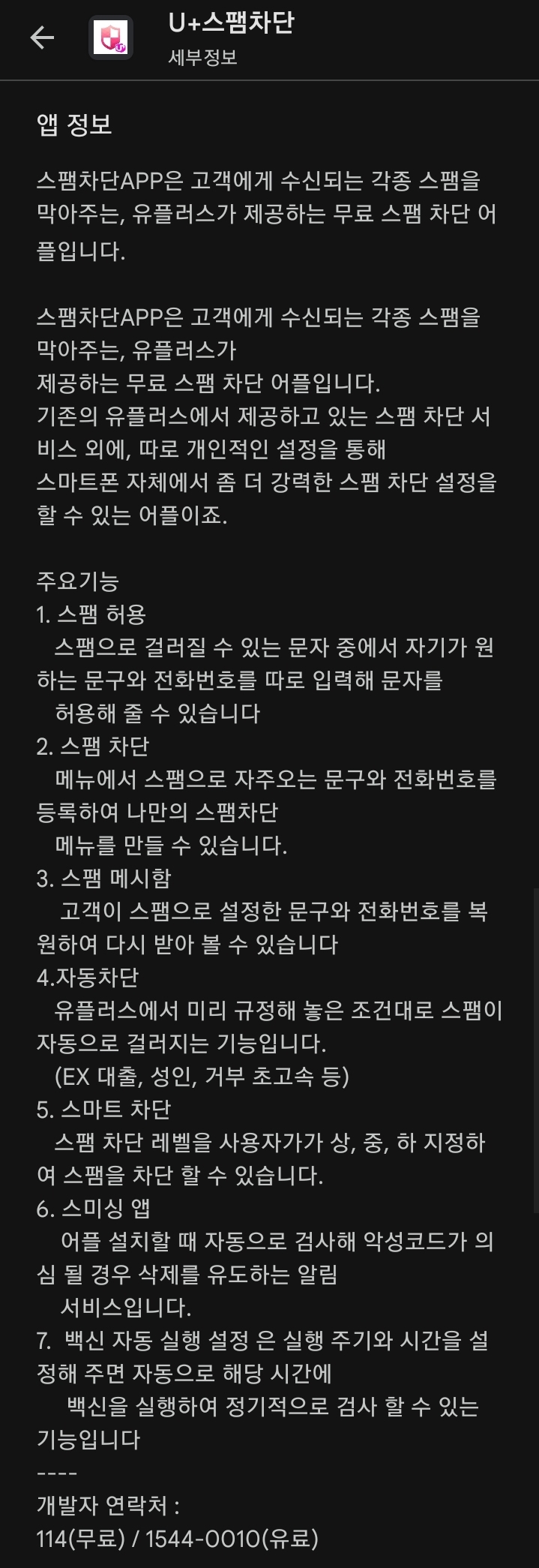 스팸차단APP은 고객에게 수신되는 각종 스팸을 막아주는, 유플러스가 제공하는 무료 스팸 차단 어플입니다.