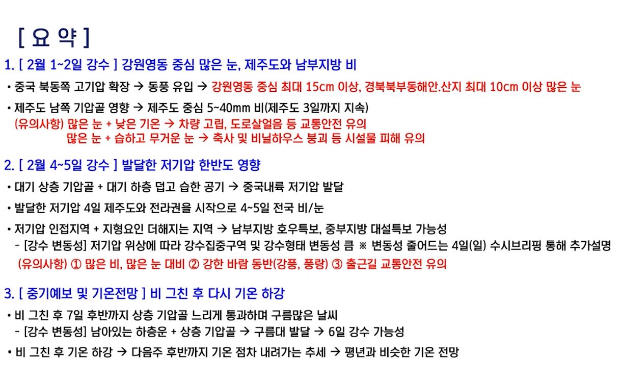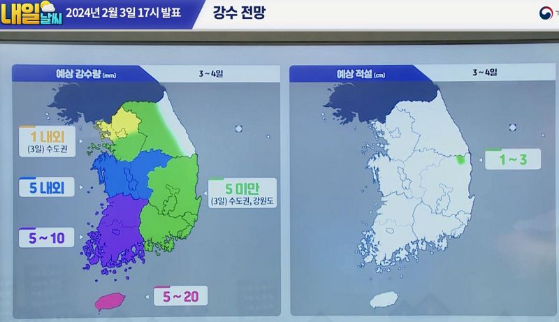 [내일날씨] 오늘 밤 전국 비/눈, 내일 경상동해안 비/눈. 2월 3일 17시 기준