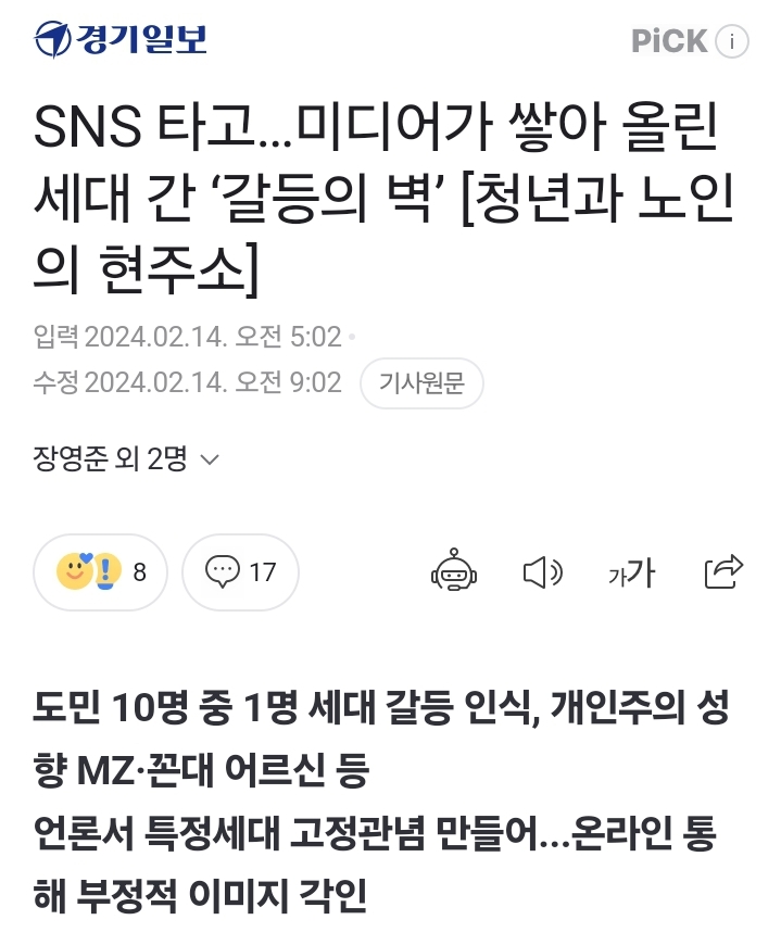 저 기사내용에 "세대갈등"이란 말은 어울리지 않아보입니다. 더 어울릴 다른 주제어가 있을 것 같은데...1