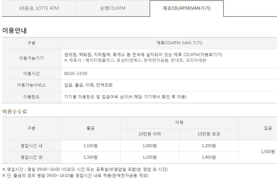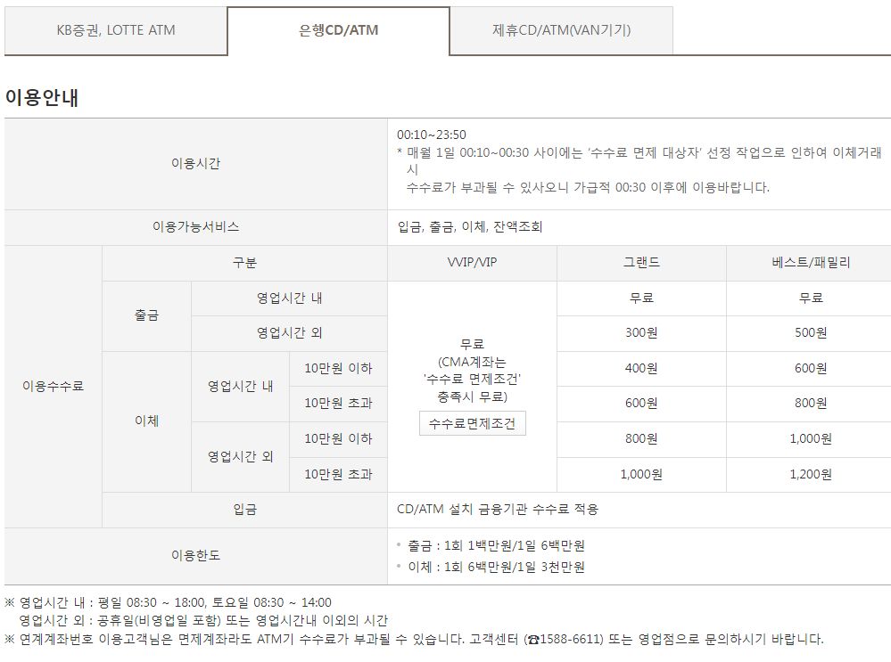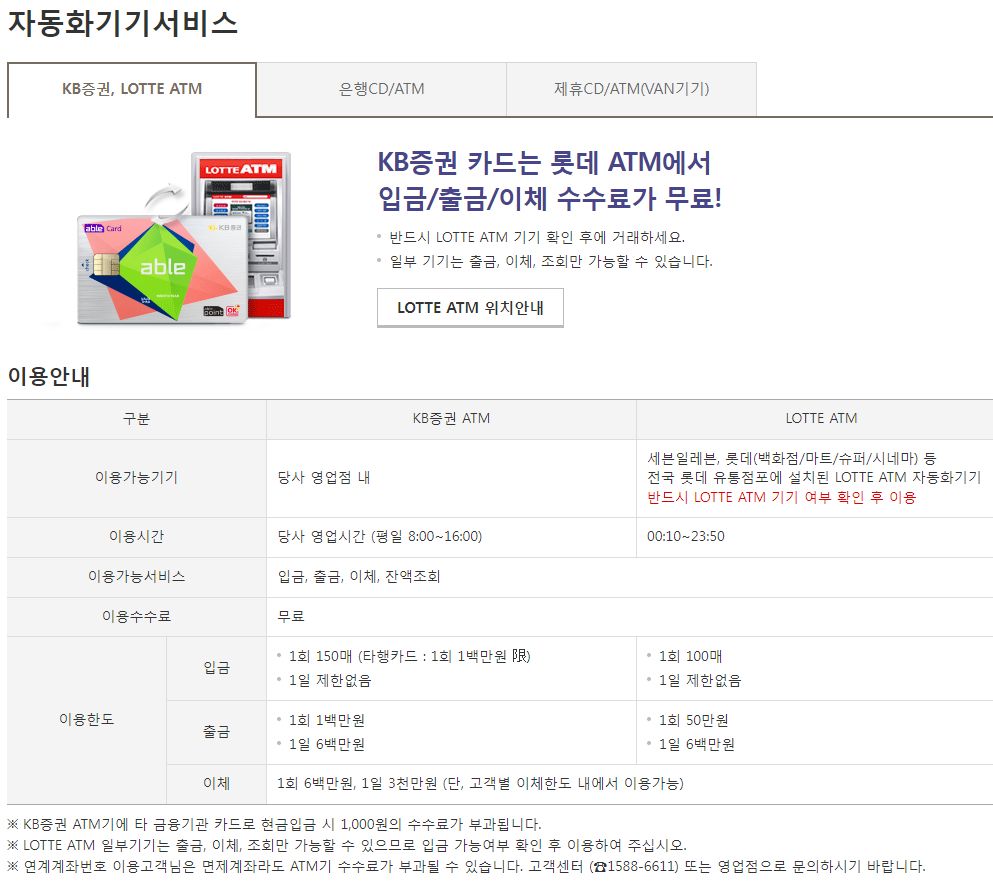 KB증권: 자동화기기서비스: 롯데ATM에서 입금/출금/이체수수료 무료