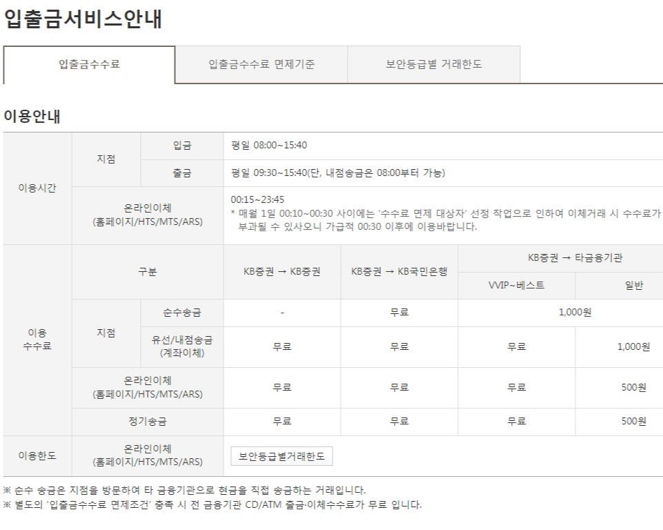 그 외, KB증권: 입출금서비스안내, 수수료 (지점/HTS/온라인)