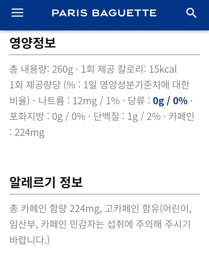 파리바게트 아메리카노 1잔에 든 카페인은 224mg