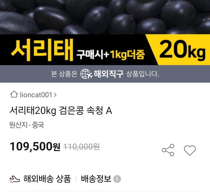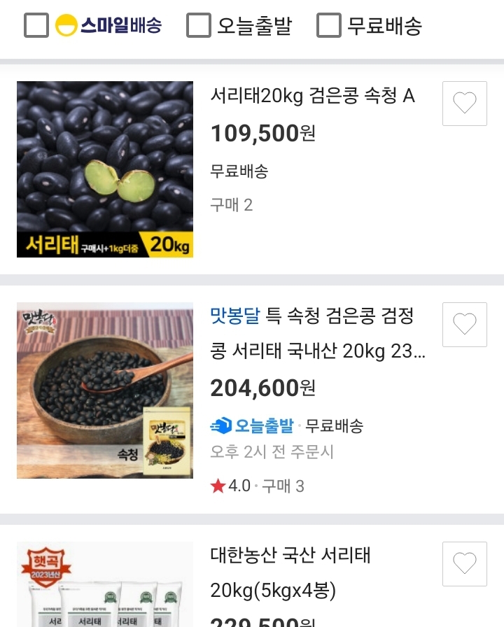 저기서 서리태 20kg에 10만원짜리가 중국산 콩 해외직구상품입니다. 그 아래 20만원부터 시작하는 것이 국내산이고요. 기가 막히죠?