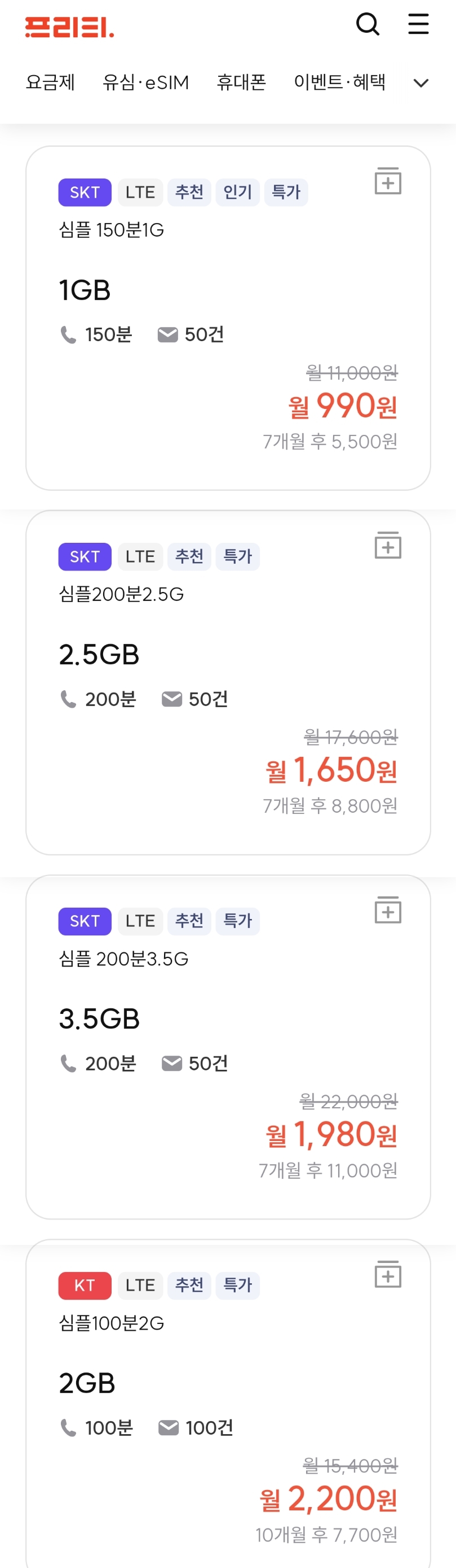 아래 스크린샷은 월요금 싼 순으로 정렬해 나온 것입니다.