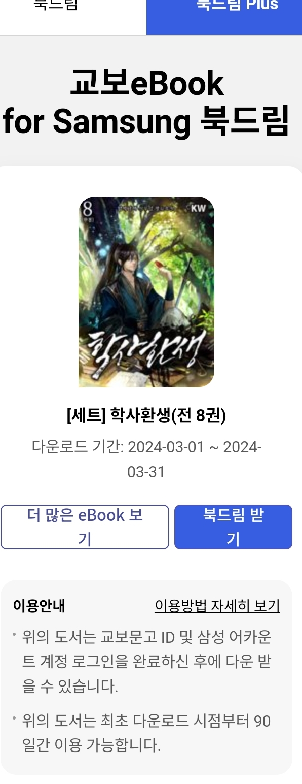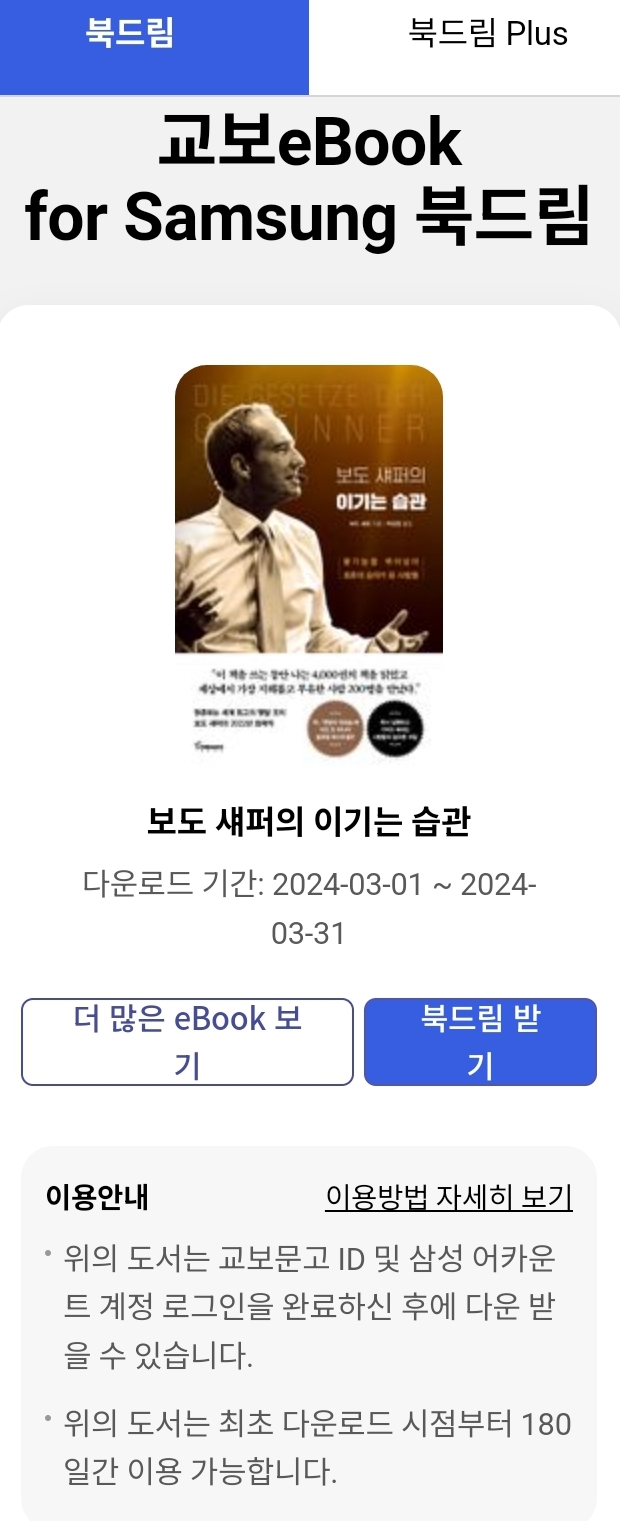 교보문고 교보 eBook for samsung 앱 사용자들용 180일 무료대여책입니다. 매달 새 책이 공개되니까 꼭 이용하세요. ^^