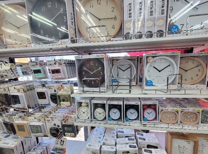 나중에 집근처 다이소에 가니까 시계 종류는 적지만 이 시계가 있었다. 깔끔한 디자인이 마음에 들었다. 다만 문자반은 마음에 들었지만 저 유광 은테는 주목을 요구하는 느낌이라서, 테두리가 밤색인 것도 있으면 좋겠다는 생각을 했다. 그리고 요즘은 첫 번째 링크 시계처럼 숫자 사이에 초침용 점이 찍혔으면서 초바늘달린 것도 나왔다. 소비자생각을 잘 반영하는 듯.