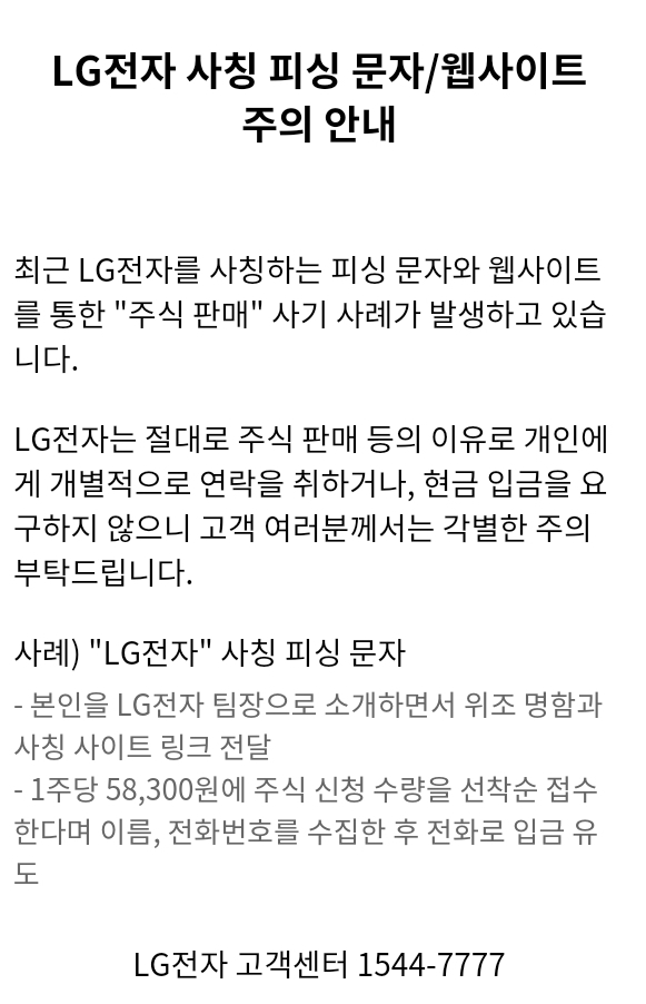 LG전자 주식매각사칭 파밍/스미싱/보이스피싱 주의 본문