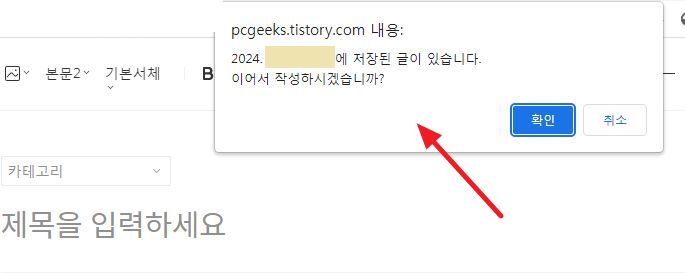 새 글을 쓰려고 편집창을 열면 아래와 같은 팝업레이어가 잠시 떴다 사라집니다.