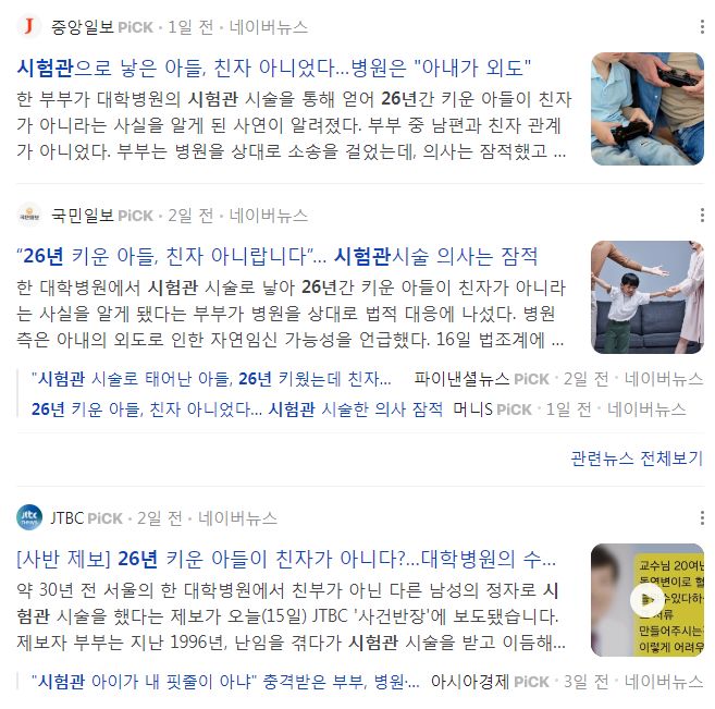 한 부부가 대학병원의 시험관 시술을 통해 얻어 26년간 키운 아들이 친자가 아니라는 사실을 알게 된 사연이 알려졌다. 부부 중 남편과 친자 관계가 아니었다. 부부는 병원을 상대로 소송을 걸었