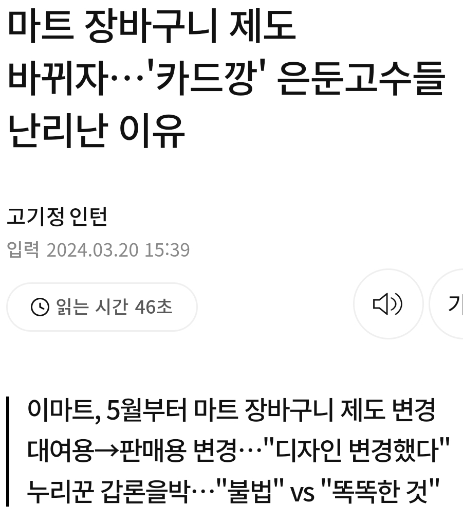 한 대형마트가 5월부터 장바구니 운영 제도를 개편하기로 했다. 장바구니로 일명 '카드깡'을 하는 사람들이 늘어났기 때문이다. 20일 온라인 커뮤니티와 사회관계...