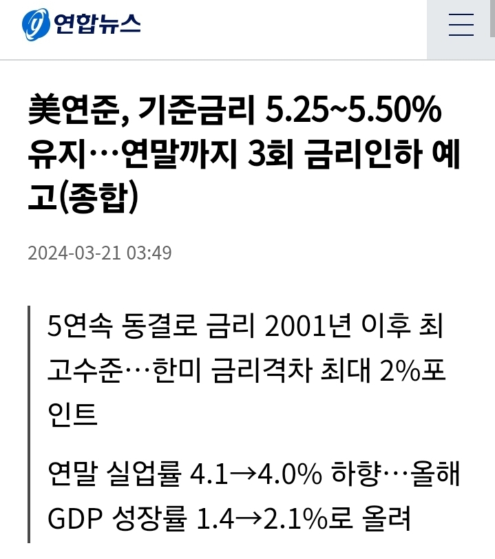 미FRB, 기준금리 5.25~5.50% 유지…연말까지 3회 금리인하 예고(연합뉴스 등) 본문