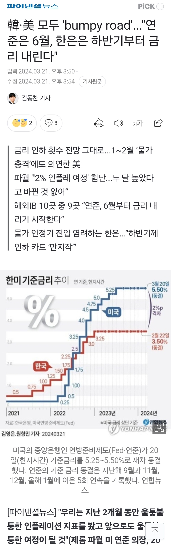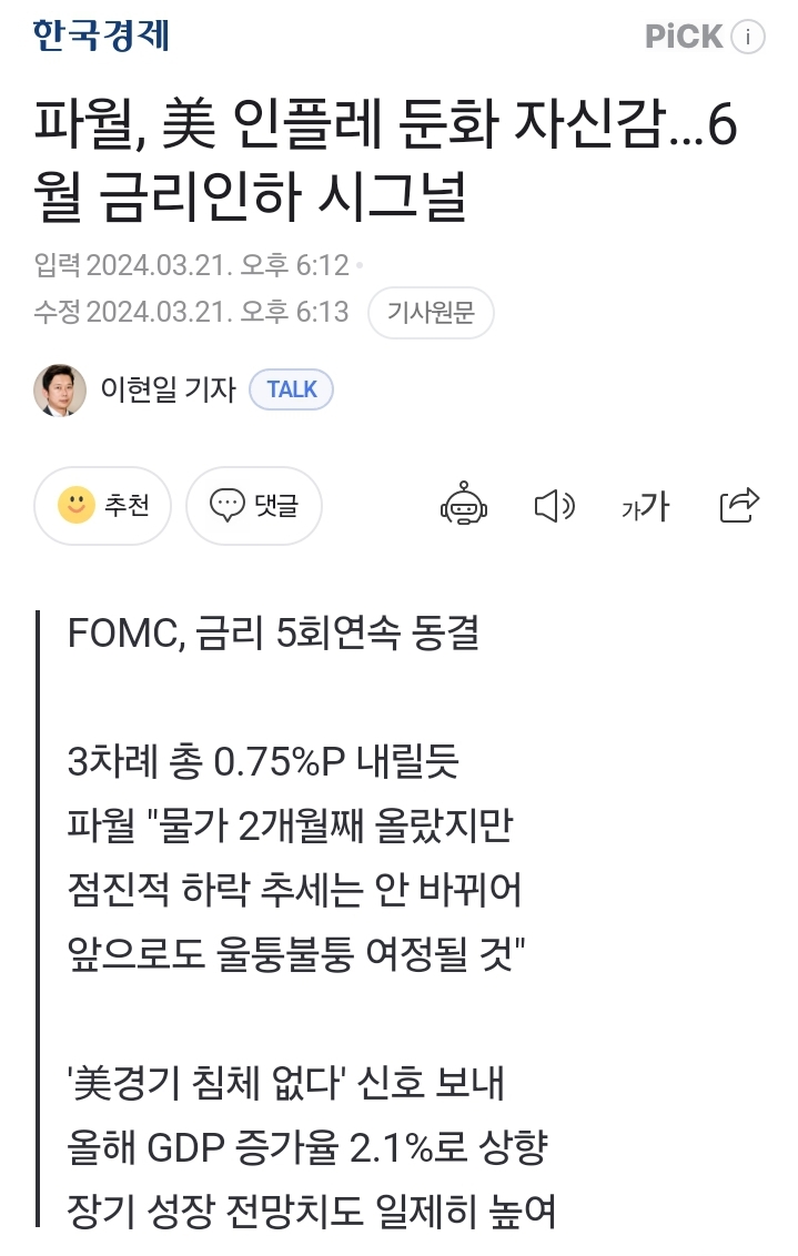 "우리는 지난 2개월 동안 울퉁불퉁한 인플레이션 지표를 봤고 앞으로도 울퉁불퉁한 여정이 될 것"(제롬 파월 미 연준 의장, 20일(현지시간) 기준금리 동결한 FOMC 직후 기자회견) "물가가 지금 굉장