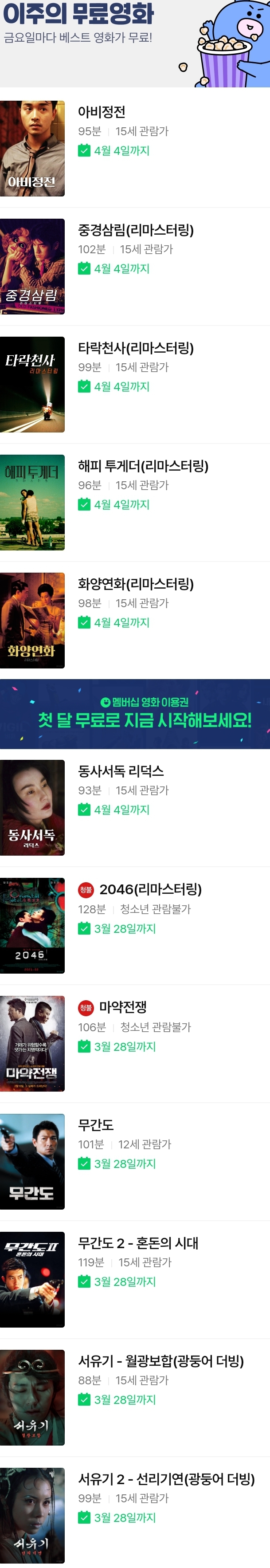 (네이버시리즈온 무료영화) 아비정전, 중경삼림, 동사서독, 서유기 월광보합/선리기연(광동어 더빙), 무간도1/2 본문