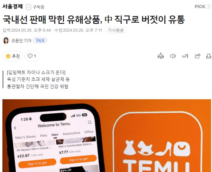 알리익스프레스와 테무 등 중국 전자상거래(e커머스) 업체를 통해 인체에 유해한 제품들이 무분별하게 판매되고 있다는 지적이 나온다. 26일 통계청에 따르면 지난해 온라인 해외 직구 규모는 6