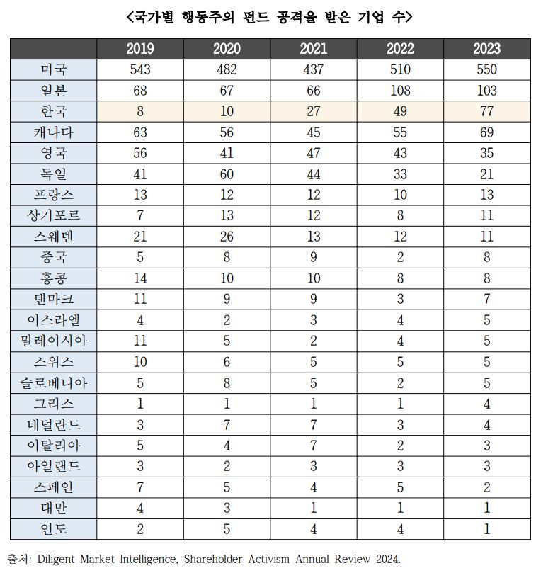 (......) 지난해 행동주의 펀드의 공격을 받은 한국 기업 수는 77개사로, 2019년 8개사와 비교해 9.6배 급증했다. (......) 이는 분석대상 23개국 중 미국 550개사, 일본 103개사에 이어 세 번째로 많은 것이다. 2019년 한국은 12위였으나 4년 만에 3위로 올라섰다.