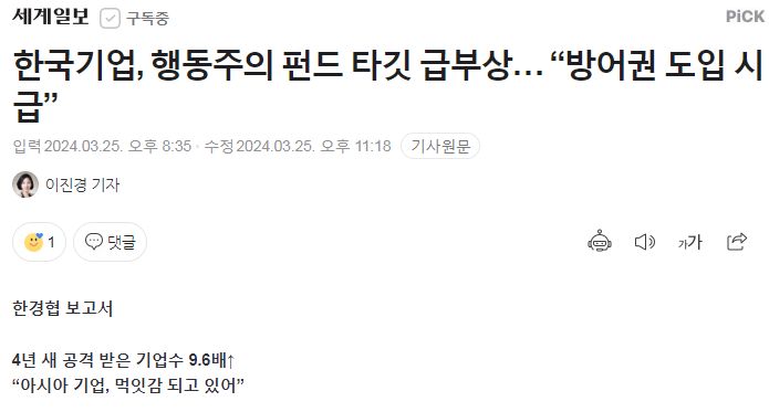한경협 보고서 4년 새 공격 받은 기업수 9.6배↑ “아시아 기업, 먹잇감 되고 있어” 국내 기업에 대한 글로벌 행동주의 펀드의 공격이 최근 4년 새 9배 이상 증가한 것으로 조사됐다. 기업의 방어