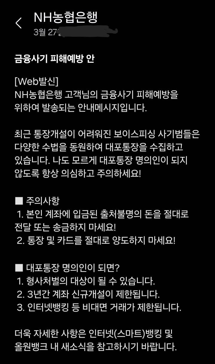 NH농협은행, 대포통장 주의 안내 문자 본문