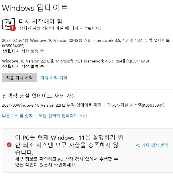 구세대 저사양 컴퓨터라서 윈도우11은 설치할 수 없습니다. (예를 들어, 설치할 때 사양검사를 하지 않게 해서 예를 들어 TPM2.0요구1를 무시할 수 있는 꼼수가 있다고는 하지만 권장되지 않고, 추후 업데이트때 블루스크린을 볼지도 모른다는공포가.. 옛날에 윈도우 10 설치할 때도 블루스크린을 몇번 봤죠)