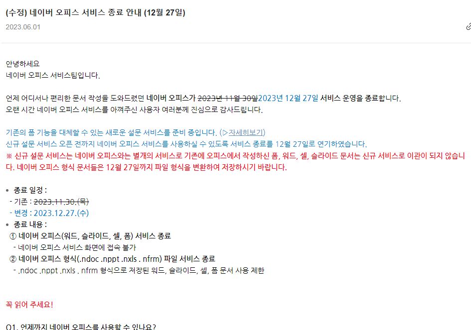 네이버 오피스, 2023년말로 서비스 종료, 네이버 폼(설문조사)은 지금도 서비스 본문