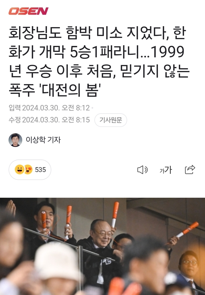 7년 만에 야구장을 찾은 ‘회장님’도 함박 미소를 지었다. 프로야구 한화 이글스가 무려 25년 만에 개막 6경기에서 5승 1패를 거두며 ‘대전의 봄’을 알렸다. 지난 29일 대전 한화생명이글스파