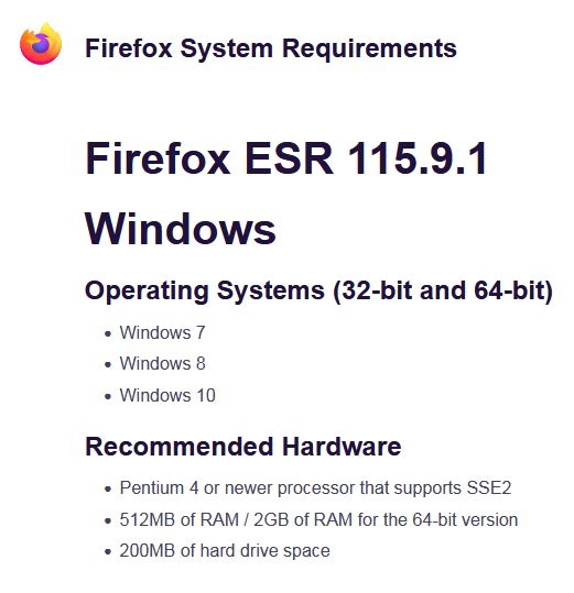 Firefox ESR 115.9.1 System Requirements
